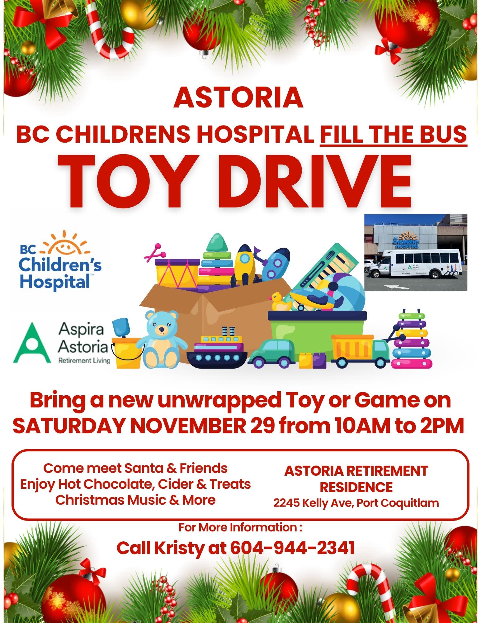On Saturday November 29th we are hosting our 2nd Annual Fill the Bus Toy Drive for B.C. Children's Hospital. Our goal is to fill every inch of space inside our Astoria bus with donations for B.C. Children's Hospital Santa's Workshop. From 10:00AM to 2:00PM, Santa and Friends will be outside Astoria (2245 Kelly Ave, Port Coquitlam) helping to load the bus, come by and enjoy music, hot chocolate, cider, treats and more. And if you can't make it on the 29th feel free to drop off a donation anytime.