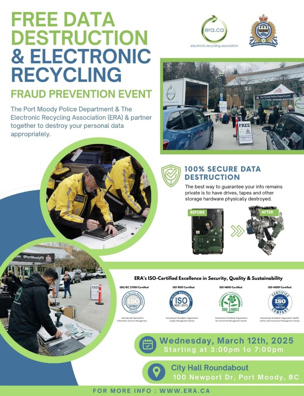 The Port Moody Police Department and The Electronic Recycling Association (ERA) partner together to destroy your personal data appropriately.