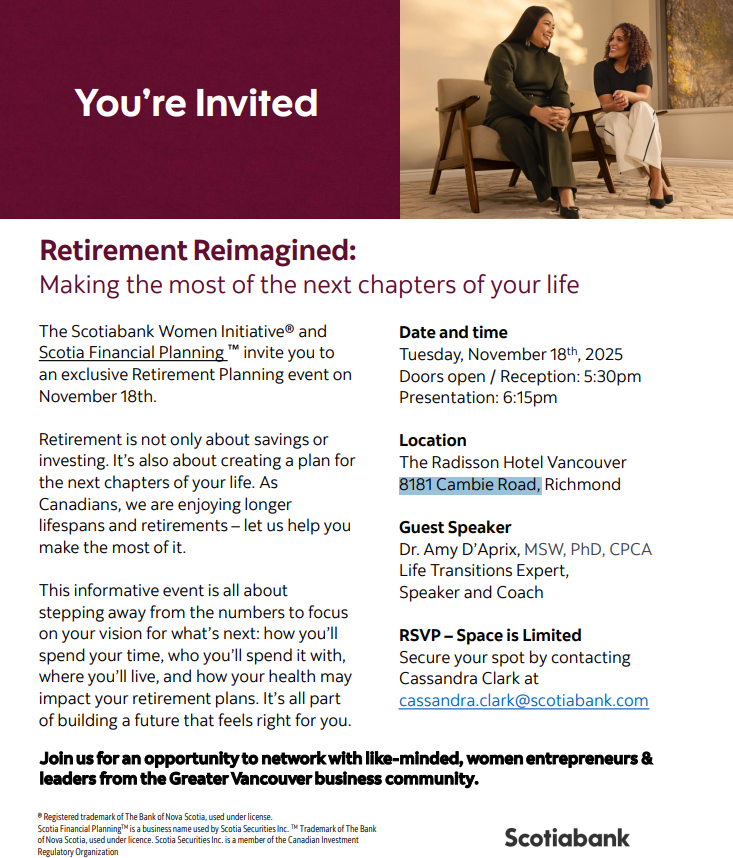 Retirement is not only about savings or investing. It’s also about creating a plan for the next chapters of your life. As Canadians, we are enjoying longer lifespans and retirements – let us help you make the most of it. This informative event is all about stepping away from the numbers to focus on your vision for what’s next: how you’ll spend your time, who you’ll spend it with, where you’ll live, and how your health may impact your retirement plans. It’s all part of building a future that feels right for you.