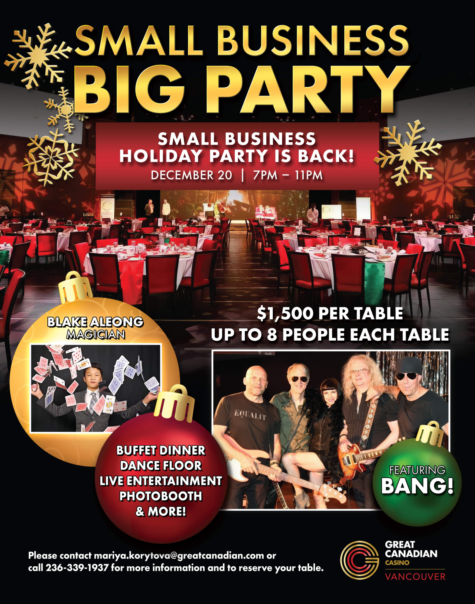 Small Business Holiday Party on December 13th & 20th at the Great Canadian Casino Vancouver, it’s a perfect opportunity for local businesses to celebrate the season and network in a fun, festive atmosphere.